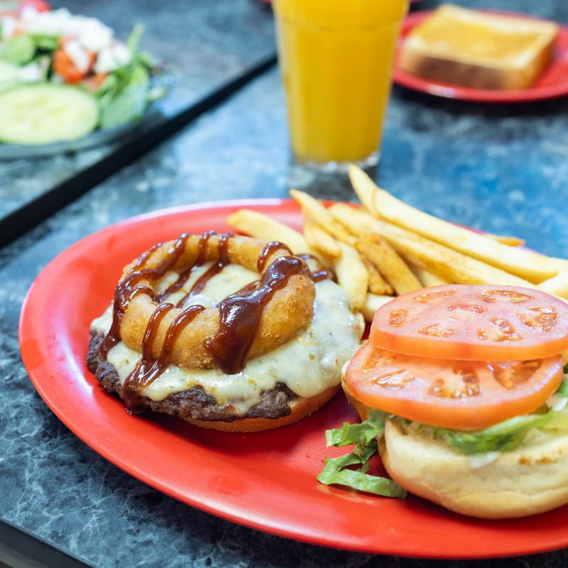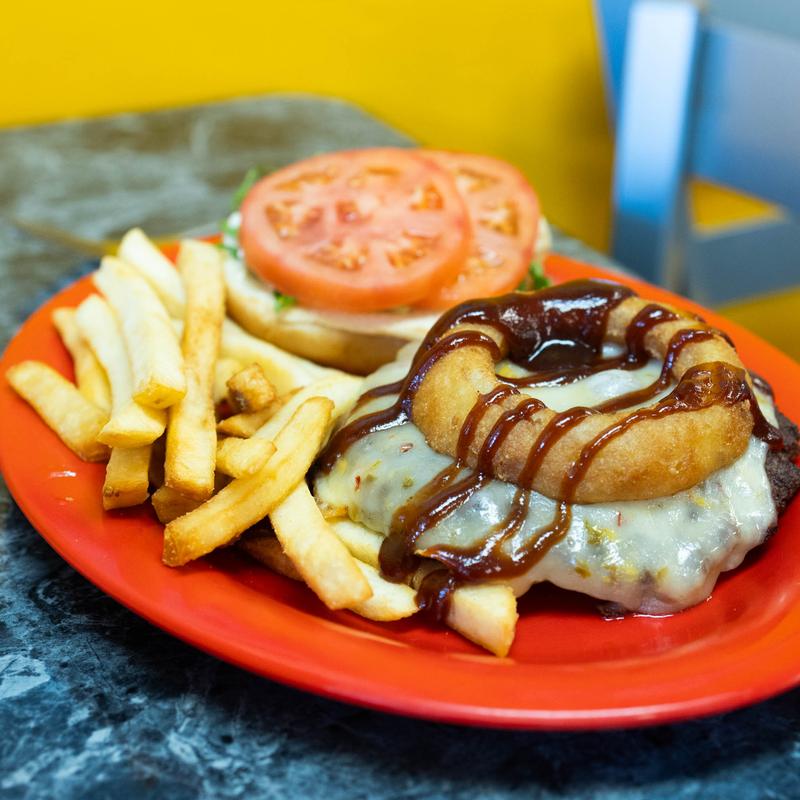 6oz Angus beef patty topped with pepperjack cheese, onion ring and BBQ sauce