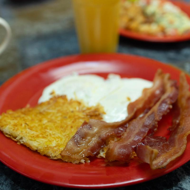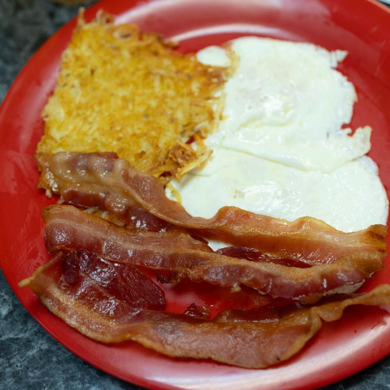 3 pancakes or 3 French toast, 2 eggs, and a choice of bacon or sausage