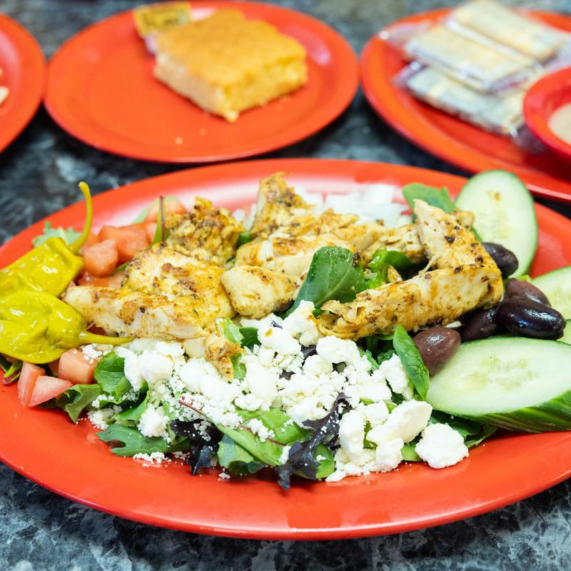 Mixed greens, tomato, cucumbers, onions, olives, peppers & feta cheese