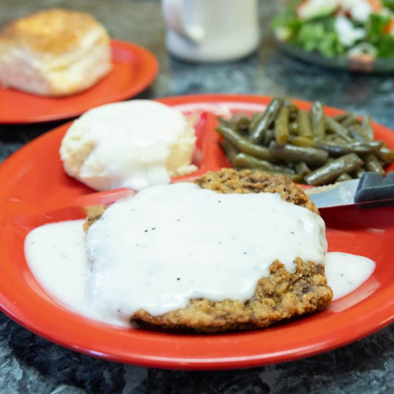 Country fried steak topped with housemade peppered gravy