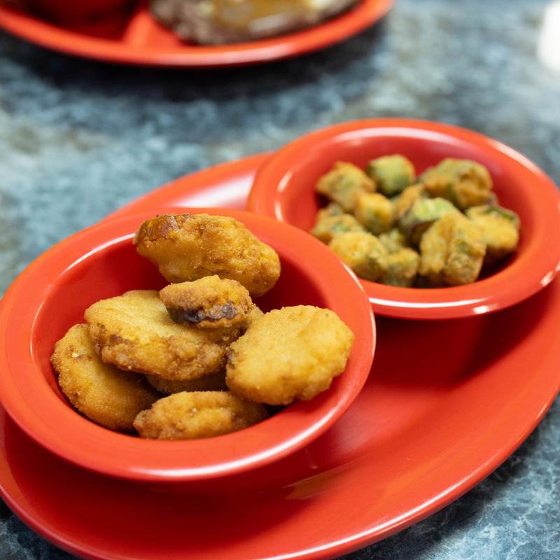Applesauce | Green Beans | Fried Okra | Potato Salad | Fried Squash | Fries | Onion Rings | Pinto Beans | Peaches | Slaw | Mashed Potatoes